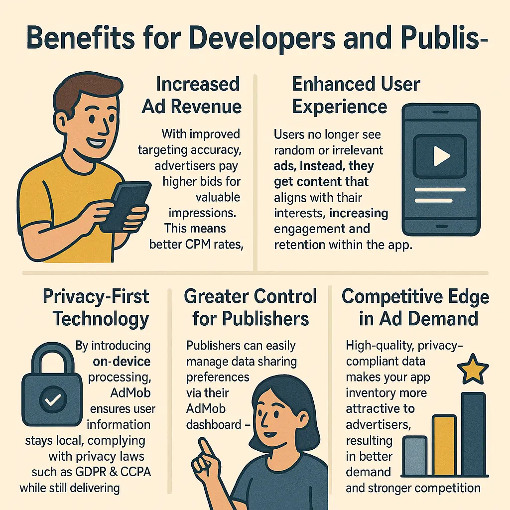 By introducing on-device processing, AdMob ensures user information stays local, complying with privacy laws such as GDPR and CCPA while still delivering personalized ads.